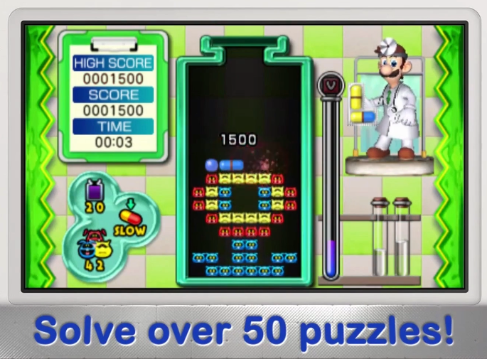 This game is a collection of modes from Arika’s previous Dr. Mario games, with the addition of a new Miracle Cure powerup system. Classic Dr. Mario, Dr. Luigi (now confident enough to wear a head mirror instead of his hat), Versus rounds, and Virus Buster mode all return, and they’re all perfectly serviceable. The Miracle Cure Laboratory is an odd addition with very little meat on the bone. Most of its levels have you clear pre-made formations of viruses. Some of them are 10 second showcases of a cool combo, others just show you a picture of something from Super Mario Bros., and others are just completely regular versus rounds. It’s fine, just not very remarkable, and it's over before you know it. Once you beat them all, you don't even get credits or a congratulations screen. There aren't even intermission animations between rounds!